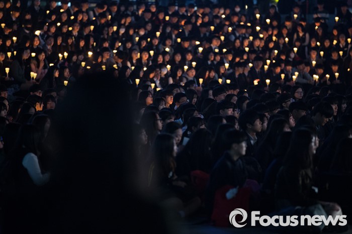(안산=포커스뉴스) 세월호 참사 2주기를 하루 앞둔 15일 오후 경기도 안산시 단원구 안산문화광장에서 안산 지역 학생들이 추모제에 참석해 촛불을 들고 있다.