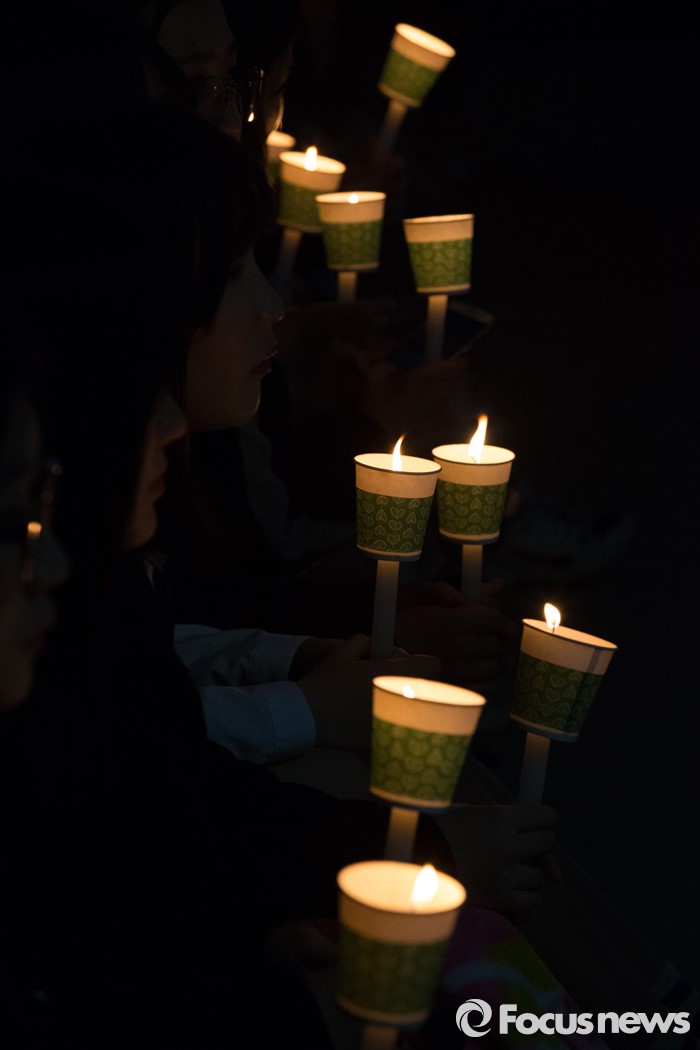 (안산=포커스뉴스) 세월호 참사 2주기를 하루 앞둔 15일 오후 경기도 안산시 단원구 안산문화광장에서 안산 지역 학생들이 추모제에 참석해 촛불을 들고 있다.
