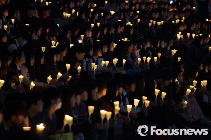 (안산=포커스뉴스) 세월호 참사 2주기를 하루 앞둔 15일 오후 경기도 안산시 단원구 안산문화광장에서 안산 지역 학생들이 추모제에 참석해 촛불을 들고 있다.