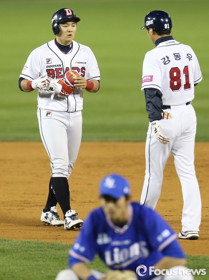 (서울=포커스뉴스) 15일 서울 잠실구장에서 열린 2016 프로야구 삼성-두산 경기 8회말 2사 1루에서 두산 대타 최주환이 우익수를 넘기는 2루타를 치고 강동우 코치의 축하를 받고 있다.
