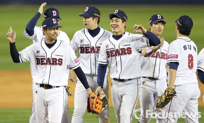 (서울=포커스뉴스) 15일 서울 잠실구장에서 열린 2016 프로야구 삼성-두산 경기에서 삼성에 7-2로 승리한 두산 선수들이 마운드에 모여 기뻐하고 있다.