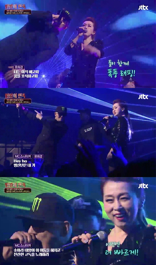 지난 15일 밤 방송된 JTBC '합합의 민족' 3회에서는 할머니 래퍼들이 자신의 애창곡에 인생 이야기를 더한 랩으로 무대를 꾸몄다. MC스나이퍼와 짝을 이룬 문희경은 ‘무인도’를 선곡, 제주도 섬 소녀였던 자신의 인생 이야기를 녹여 랩으로 선보였다.