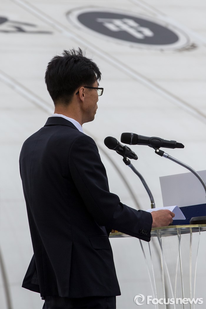 (안산=포커스뉴스) 16일 오전 경기도 안산시 단원구 화랑유원지에 마련된 합동분향소에서 열린 '세월호 참사 2년 기억식'에서 한 유가족이 경과 보고를 하고 있다.