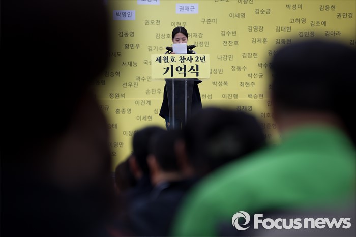 (안산=포커스뉴스) 16일 오전 경기도 안산시 단원구 화랑유원지에 마련된 합동분향소에서 열린 '세월호 참사 2년 기억식'에 참석한 한 유가족이 편지를 낭동 하고 있다.