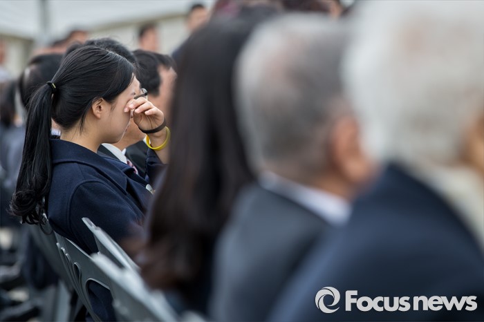 (안산=포커스뉴스) 16일 오전 경기도 안산시 단원구 화랑유원지에 마련된 합동분향소에서 열린 '세월호 참사 2년 기억식'에 참석한 한 유가족이 눈물을 흘리고 있다.