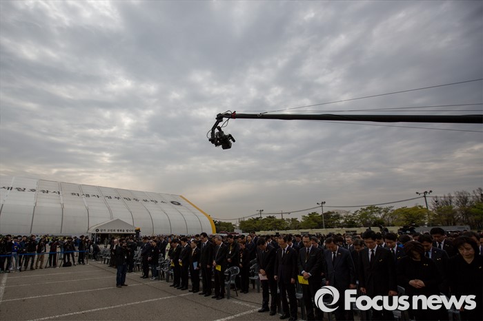 (안산=포커스뉴스) 16일 오전 경기도 안산시 단원구 화랑유원지에 마련된 합동분향소에서 열린 '세월호 참사 2년 기억식'에서 유가족 및 참가자들이 묵념을 하고 있다.