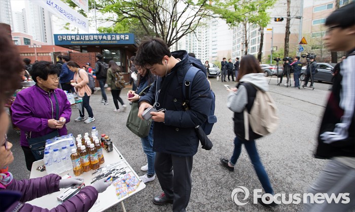 (서울=포커스뉴스) 17일 오전 서울 강남구 단국대학교부속고등학교에서 삼성그룹 공개채용시험 직무적성검사(GSAT)를 치르기 위한 취업준비생들이 고사장 입장 전 필기도구를 구매하고 있다.