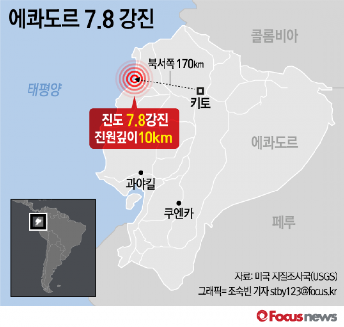 (서울=포커스뉴스) 미국 지질조사국(USGS)에 따르면 지진은 16일 밤 11시58분경(현지시간) 남미 에콰도르 해안에서 진도 7.8 규모의 강진이 발생했다.