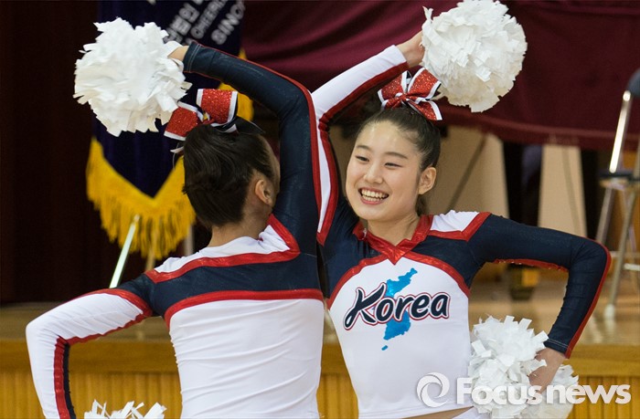(서울=포커스뉴스) 17일 오후 서울 서대문구 동명여자중학교 체육관에서 열린 '2016 치어리딩 국가대표 선수단 출정식'에 참석한 선수들이 치어리딩 연기를 선보이고 있다.