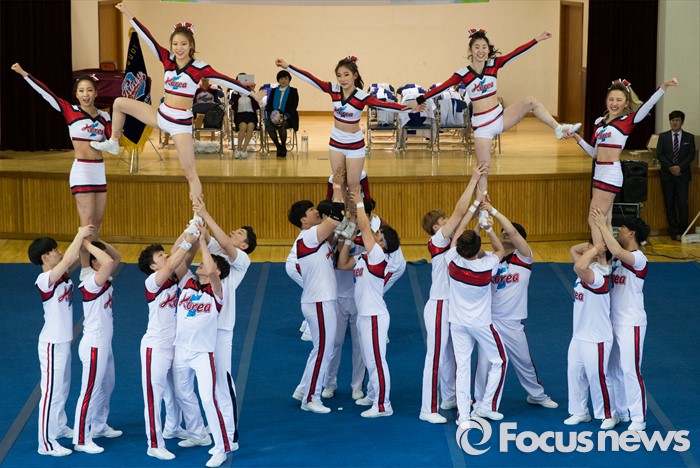 (서울=포커스뉴스) 17일 오후 서울 서대문구 동명여자중학교 체육관에서 열린 '2016 치어리딩 국가대표 선수단 출정식'에 참석한 선수들이 치어리딩 연기를 선보이고 있다.
