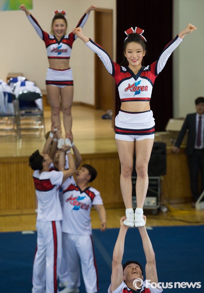 (서울=포커스뉴스) 17일 오후 서울 서대문구 동명여자중학교 체육관에서 열린 '2016 치어리딩 국가대표 선수단 출정식'에 참석한 선수들이 치어리딩 연기를 선보이고 있다.