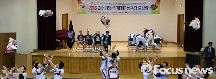 (서울=포커스뉴스) 17일 오후 서울 서대문구 동명여자중학교 체육관에서 열린 '2016 치어리딩 국가대표 선수단 출정식'에 참석한 선수들이 치어리딩 연기를 선보이고 있다.