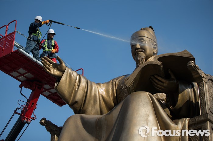 (서울=포커스뉴스) 18일 오전 서울 세종로사거리 광화문광장에서 서울시 관계자들이 세종대왕 동상 세척작업을 하고 있다.