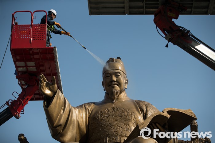 (서울=포커스뉴스) 18일 오전 서울 세종로사거리 광화문광장에서 서울시 관계자들이 세종대왕 동상 세척작업을 하고 있다.