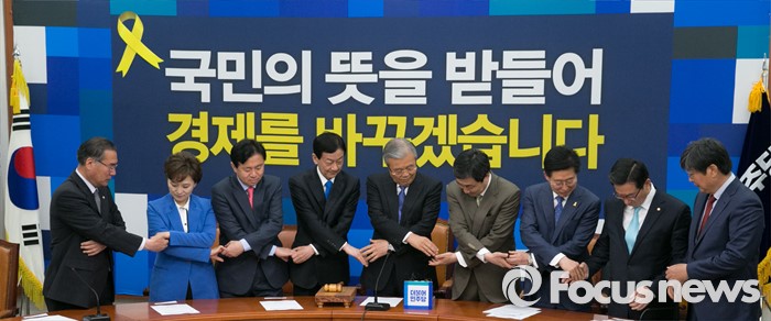 (서울=포커스뉴스) 김종인 더불어민주당 비대위 대표와 비대위원들이 18일 오전 서울 여의도 국회에서 비상대책위원회의에 앞서 취재진을 향해 포즈를 취하고 있다. 왼쪽부터 이개호, 김현미, 김영춘, 진영 비대위원, 김 대표, 이종걸 원내대표, 양승조, 정성호, 이춘석 비대위원.