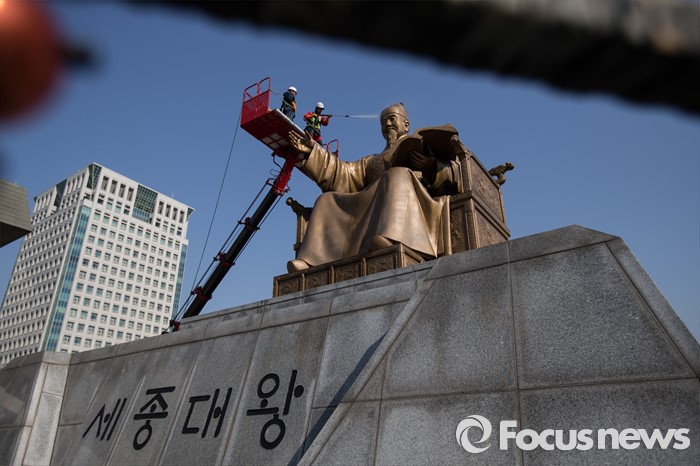 (서울=포커스뉴스) 18일 오전 서울 세종로사거리 광화문광장에서 서울시 관계자들이 세종대왕 동상 세척작업을 하고 있다.