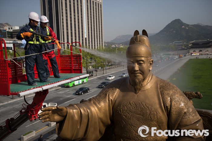 (서울=포커스뉴스) 18일 오전 서울 세종로사거리 광화문광장에서 서울시 관계자들이 세종대왕 동상 세척작업을 하고 있다.