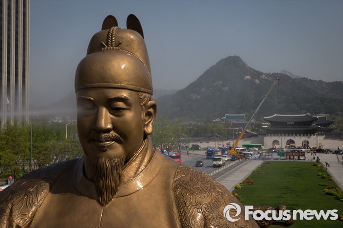(서울=포커스뉴스) 18일 오전 서울 세종로사거리 광화문광장에서 서울시 관계자들이 세종대왕 동상 세척 및 보존 작업을 하고 있다.