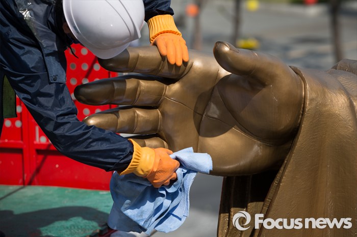 (서울=포커스뉴스) 18일 오전 서울 세종로사거리 광화문광장에서 서울시 관계자들이 세종대왕 동상 세척 및 보존 작업을 하고 있다.