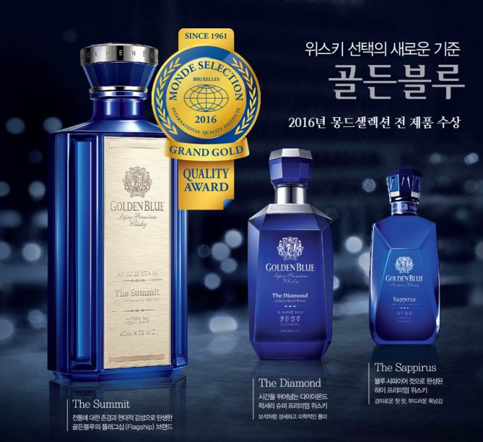 특히, 지난해 5월 출시된 '골든블루 서미트'는 올해 처음 참여해 전세계 위스키 중 최상위 품질을 지닌 위스키에만 부여되는 최우수금상(Grand Gold)을 받았다. 몽드셀렉션에서 최우수금상의 영예를 얻을 수 있는 제품은 전세계적으로 약 60개에 불과하다.