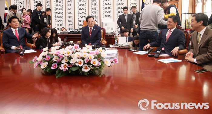 (서울=포커스뉴스) 18일 오전 서울 여의도 국회 의장실에서 열린 여야 3당 원내대표 회동에서 새누리당 원유철 원내대표가 "원내1당이 먼저 하시라"며 더불어민주당 이종걸 원내대표에서 발언 순서를 양보하고 있다. 왼쪽부터 새누리당 원유철 원내대표, 정의화 국회의장, 더불어민주당 이종걸 원내대표, 국민의당 주승용 원내대표.