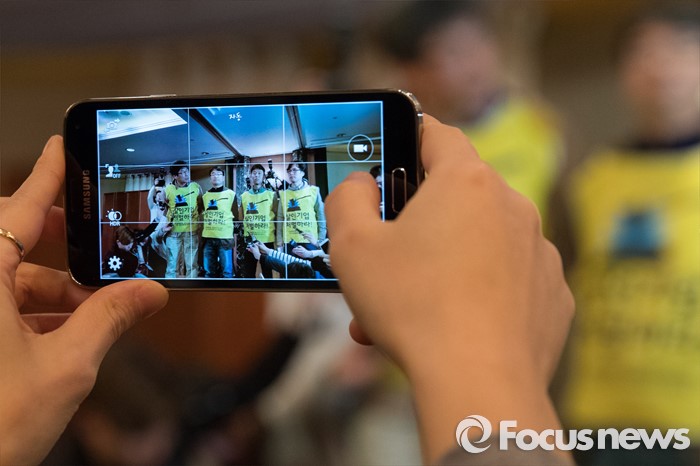 (서울=포커스뉴스) 18일 오전 서울 중구 롯데호텔앤리조크 서울에서 열린 가습기 살균제 사망사건 관련 기자회견이 끝나고 피해자 유족들을 비롯한 시민단체 회원들이 입장을 발표하고 있다.