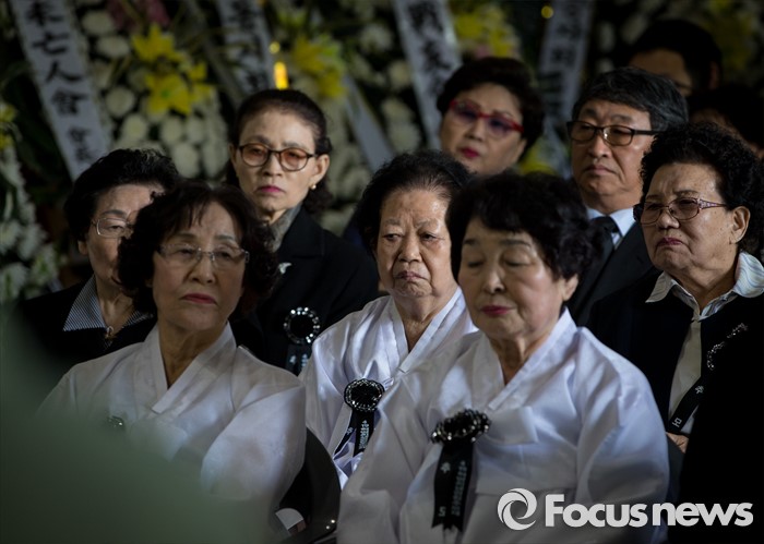 (서울=포커스뉴스) 4·19 혁명 56주기를 하루 앞둔 18일 오전 서울 강북구 국립4.19 민주묘지 유영봉안소에서 열린 4.19 혁명 희생영령 추모제를 찾은 유가족들이 굳은 표정을 짓고 있다.