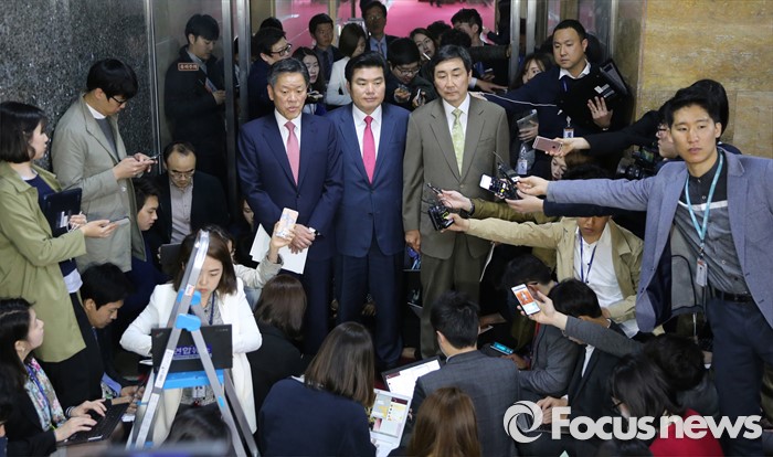 (서울=포커스뉴스) 정의화 국회의장 주재로 진행된 3당 원내대표 회동을 마친 원유철(가운데) 새누리당 원내대표, 이종걸(오른쪽) 더불어민주당 원내대표, 주승용 국민의당 원내대표가 18일 오전 서울 여의도 국회 의장집무실 앞에서 취재진 질문에 답하고 있다.