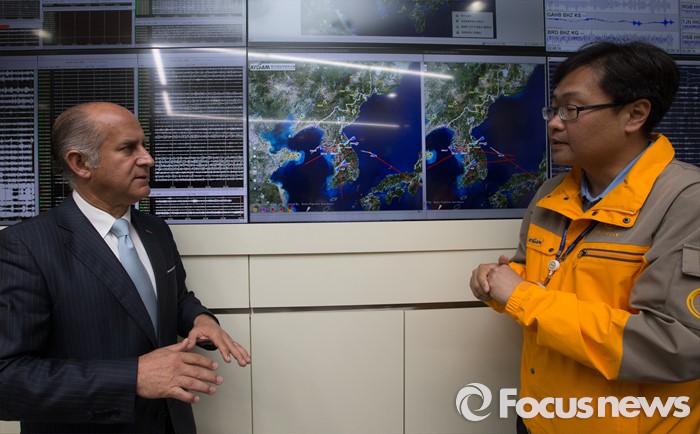 (대전=포커스뉴스) 오스카 에레라 주한 에콰도르 대사가 18일 오전 대구 유성구 한국지질자원연구원 내 지진연구센터 상황실을 방문, 에콰도르 현지 지진상황에 대한 설명듣고 있다.