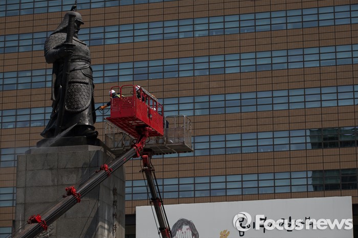 (서울=포커스뉴스) 18일 오전 서울 세종로사거리 광화문광장에서 서울시 관계자들이 이순신장군 동상 세척 및 보존 작업을 하고 있다.