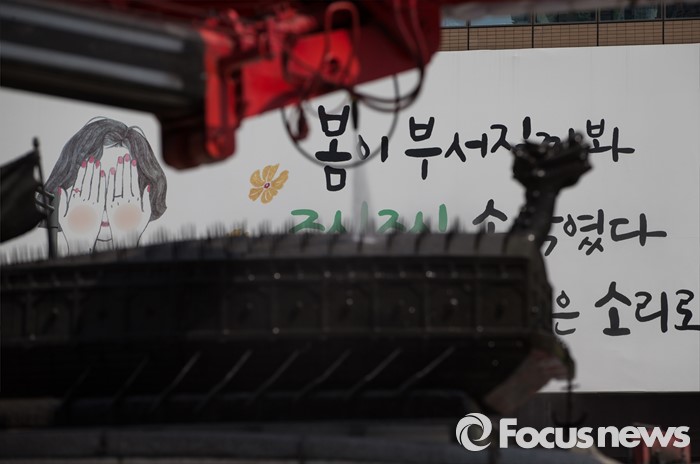 (서울=포커스뉴스) 18일 오전 서울 세종로사거리 광화문광장에서 서울시 관계자들이 이순신장군 동상 세척 및 보존 작업을 하고 있다.