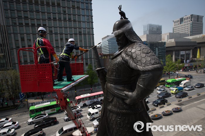 (서울=포커스뉴스) 18일 오전 서울 세종로사거리 광화문광장에서 서울시 관계자들이 이순신장군 동상 세척 및 보존 작업을 하고 있다.