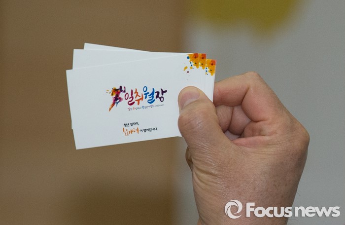 (대전=포커스뉴스) 이기권 고용노동부장관이 대전 유성구 충남대학교를 방문, 대학생들과 함께 찾아가는 정책설명회 및 토크콘서트에서 명함 뒷면에 '일취월장'문구를 보이고 있다.