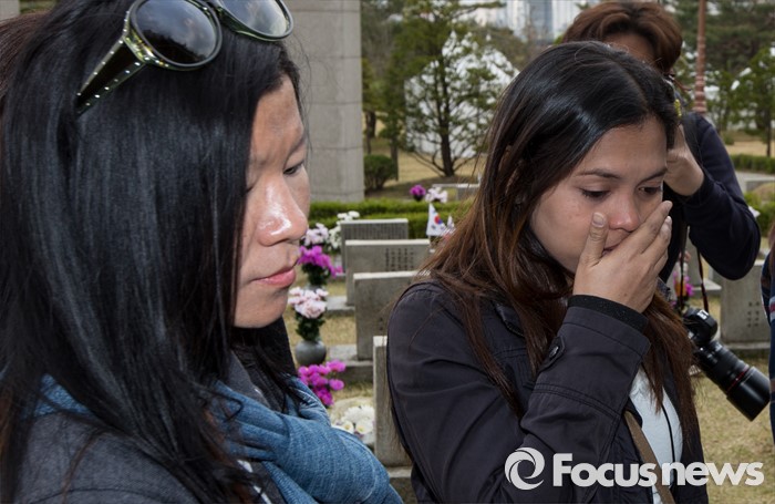 (서울=포커스뉴스) 4·19 혁명 56주기를 하루 앞둔 18일 오후 서울 강북구 국립4.19 민주묘지를 찾은 한신대학교 신학과의 필리핀 학생이 최연소 희생자인 고 임동성(당시 10세)군의 묘소를 참배 후 눈물을 훔치고 있다.