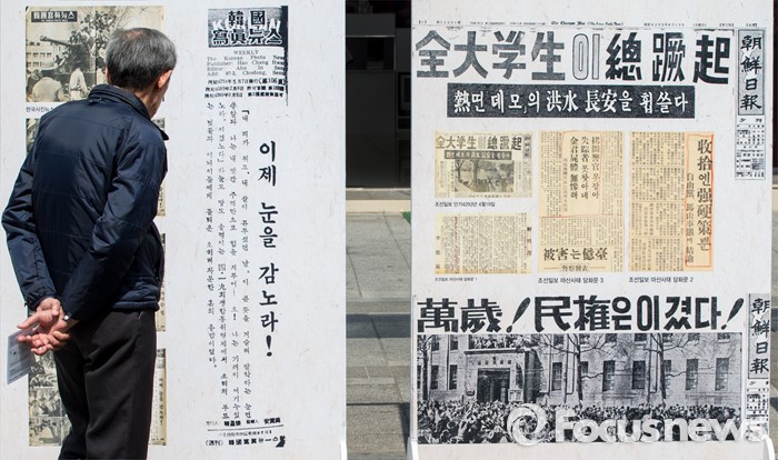 (서울=포커스뉴스) 4·19 혁명 56주기를 하루 앞둔 18일 오후 서울 강북구 광산사거리 인근에서 열린 '4.19 혁명 국민문화제 2016'에 참석한 시민이 혁명 당시 신문기사들을 보고 있다.