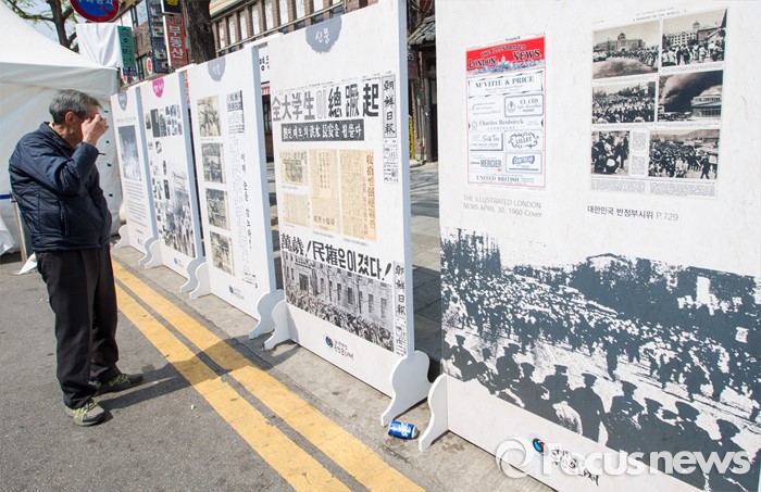 (서울=포커스뉴스) 4·19 혁명 56주기를 하루 앞둔 18일 오후 서울 강북구 광산사거리 인근에서 열린 '4.19 혁명 국민문화제 2016'에 참석한 시민이 혁명 당시 신문기사들을 보고 있다.