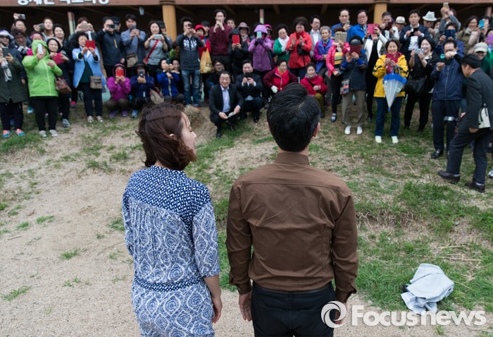 (서울=포커스뉴스) 제20대 국회의원 선거에서 당선된 김영호 더불어민주당 서대문을 당선자와 부인 정현경씨가 18일 오후 서울 서대문구 홍제천 폭포마당에서 입수 전 시민들에게 인사하고 있다. 김 당선자는 서대문을 지역 투표율 60% 달성 시 홍제천 입수, 아내는 픽미댄스를 추겠다고 약속 하였다.