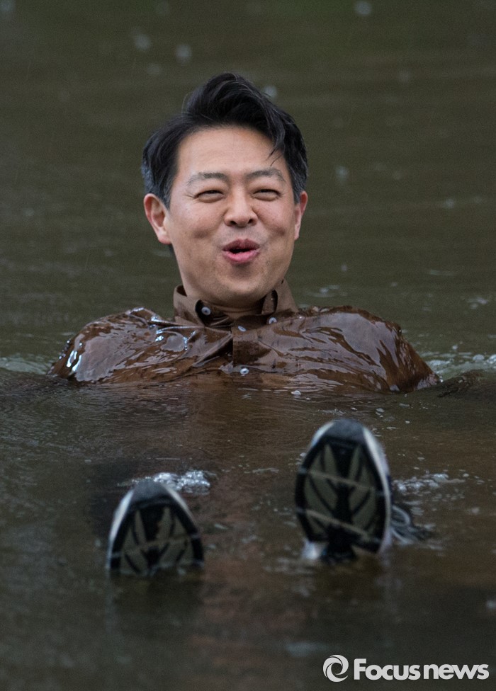 (서울=포커스뉴스) 제20대 국회의원 선거에서 당선된 김영호 더불어민주당 서대문을 당선자가 18일 오후 서울 서대문구 홍제천 폭포마당에 입수 하고 있다. 김 당선자는 서대문을 지역 투표율 60% 달성 시 홍제천 입수, 아내는 픽미댄스를 추겠다고 약속 하였다.