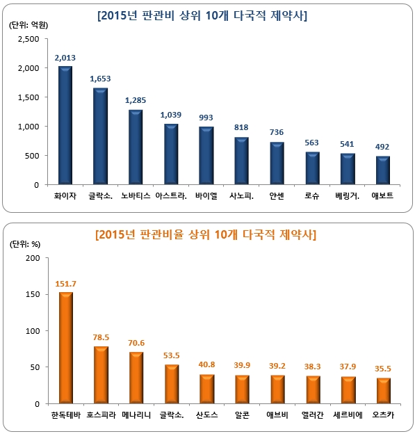 이어 △글락소스미스클라인(1653억원) △한국노바티스(1285억원) △한국아스트라제네카(1039억원) △바이엘코리아(993억원) △사노피-아벤티스코리아(818억원) △한국얀센(736억원) △한국로슈(563억원) △한국베링거인겔하임(541억원) △한국애보트(492억원) 순이었다.