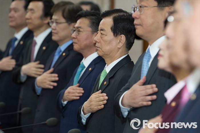 (서울=포커스뉴스) 19일 오전 서울 종로구 정부서울청사에서 열린 국무회의에서 한민구(오른쪽 네번째부터) 국방부 장관, 홍용표 통일부 장관, 최양희 미래창조과학부 장관, 윤병세 외교부 장관을 비롯한 국무위원들이 국기에 대한 경례를 하고 있다.