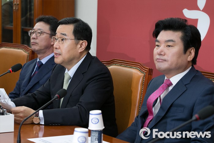 (서울=포커스뉴스) 김정훈(가운데) 새누리당 정책위의장이 19일 오전 서울 여의도 국회에서 열린 원내대표단회의에 참석해 발언하는 동안, 원유철 원내대표가 생각에 잠겨 있다.