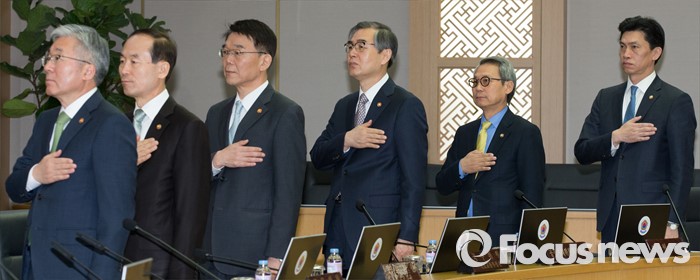 (세종=포커스뉴스) 19일 오전 세종시 정부세종청사 국무회의장에서 서울-세종 영상회의로 열린 국무회의에 참석한 국무위원들이 국기에 대한 경례를 하고 있다.