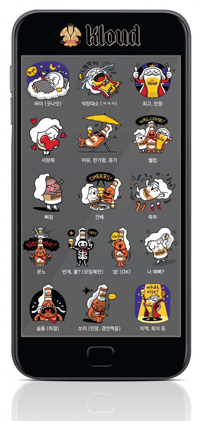 총 16개로 '클라우드' 공식 캐릭터를 활용해 '최고', '사랑해', '여유', '축하', '슬픔' 등 감정표현과 맥주와 함께 즐길 수 있는 여가문화를 표현한 '건배', '회식', '모임제안' 등의 콘텐츠로 구성됐다.