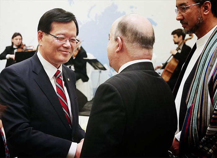 (서울=포커스뉴스) 정의화 국회의장이 18일 오후(현지시각) 모스크바 롯데호텔에서 유라시아 각국 의회지도자들을 초청해 열린 한·러 공동 주최 만찬에 참석자들과 인사하고 있다. <사진제공=국회>