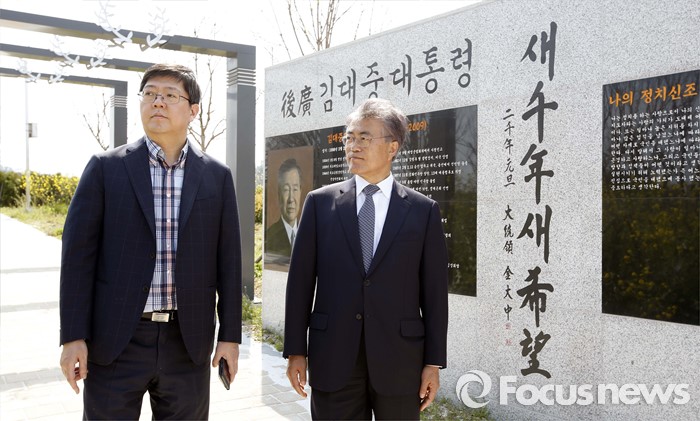 (서울=포커스뉴스) 문재인(오른쪽) 전 더불어민주당대표가 18일 김대중 전 대통령의 3남인 김홍걸 더불어민주당 국민통합위원장과 함께 전남 신안 하의도에 있는 김 전 대통령의 생가를 방문, 기념비를 둘러보고 있다.<사진제공=문재인의원실>