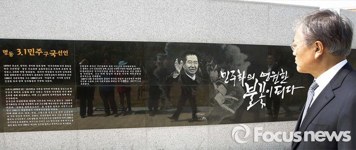(서울=포커스뉴스) 문재인 전 더불어민주당대표가 18일전남 신안 하의도에 있는 김 전 대통령의 생가를 방문, 기념비를 관람하고 있다.<사진제공=문재인의원실>