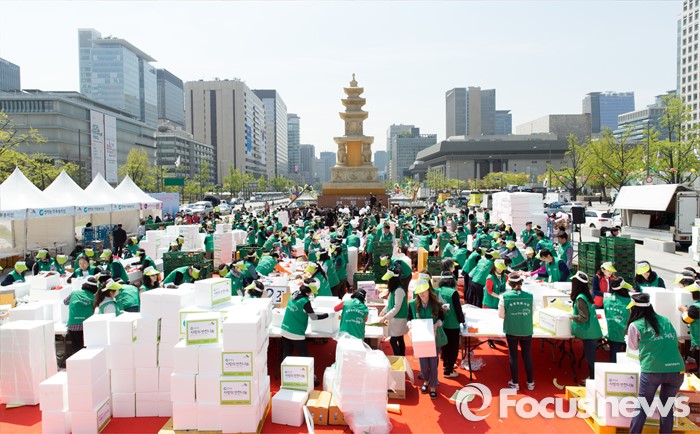 (서울=포커스뉴스) 19일 오전 서울 광화문광장에서 청정원 사랑의 반찬나눔 행사에 참석한 대상 임직원들과 자원봉사자들이 어려운 이웃들에게 전달할 선물세트를 포장하고 있다.