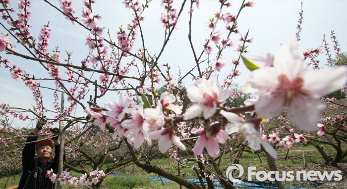 (세종=포커스뉴스) 화창한 봄 날씨를 보인 19일 오전 세종시 연서면 복숭아밭에서 농민이 복사꽃을 속아내고 있다.