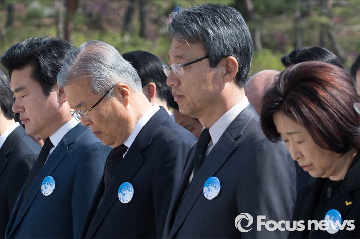 (서울=포커스뉴스) 19일 오전 서울 강북구 국립 4.19 민주묘지에서 열린 '제56주년 4.19혁명 기념식'에 참석한 여,야 대표들이 묵념을 하고 있다. 왼쪽부터 원유철 새누리당 원내대표, 김종인 더불어민주당 비대위 대표, 김성식 국민의당 20대 국회의원 당선인, 심상정 정의당 대표