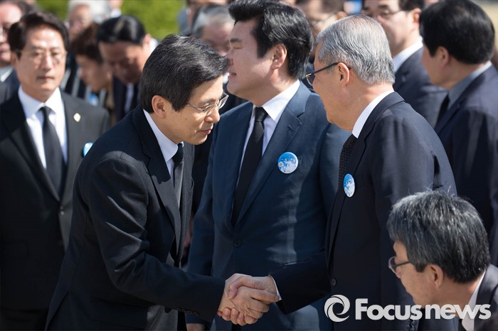 (서울=포커스뉴스) 19일 오전 서울 강북구 국립 4.19 민주묘지에서 열린 '제56주년 4.19혁명 기념식'에서 황교안(왼쪽) 국무총리가 김종인 더불어민주당 비대위 대표와 악수하고 있다.